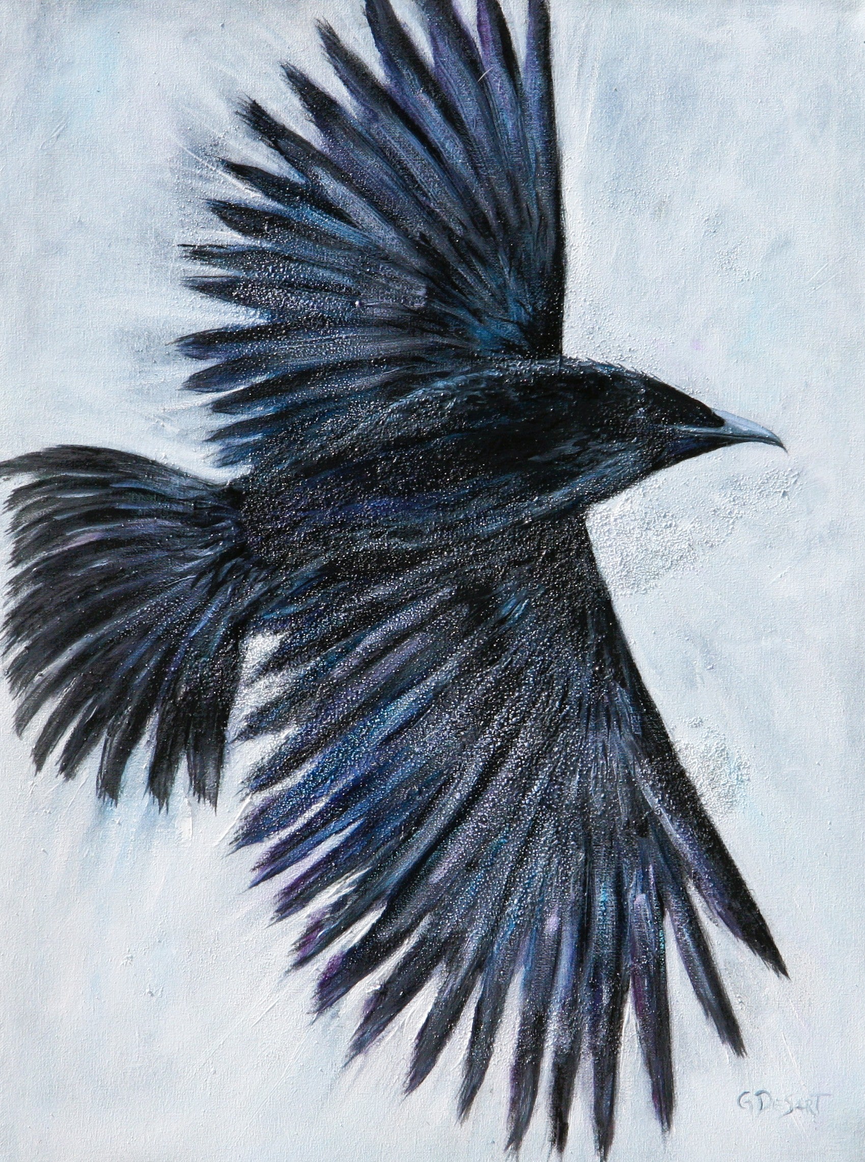 This painting is full of texture using a palette knife and oil paint. Layers were built on each other adding depth. Vivid deep blues and purples highlight the wing span.