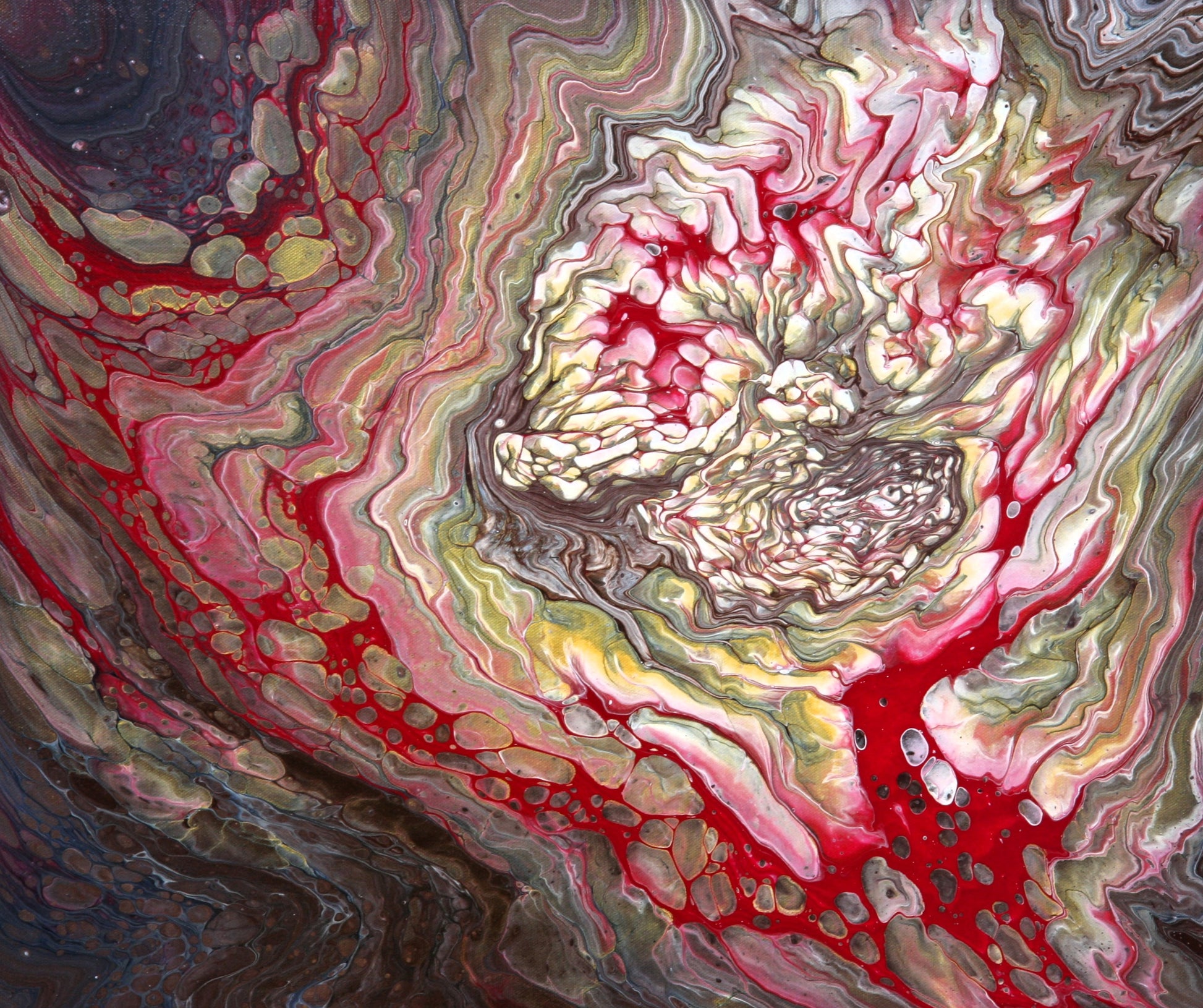 Fluid art with cloud mix using an enamel medium. This technique challenges the acrylic paint and they react with each other giving the viewer a feeling there are clouds moving thru the painting.