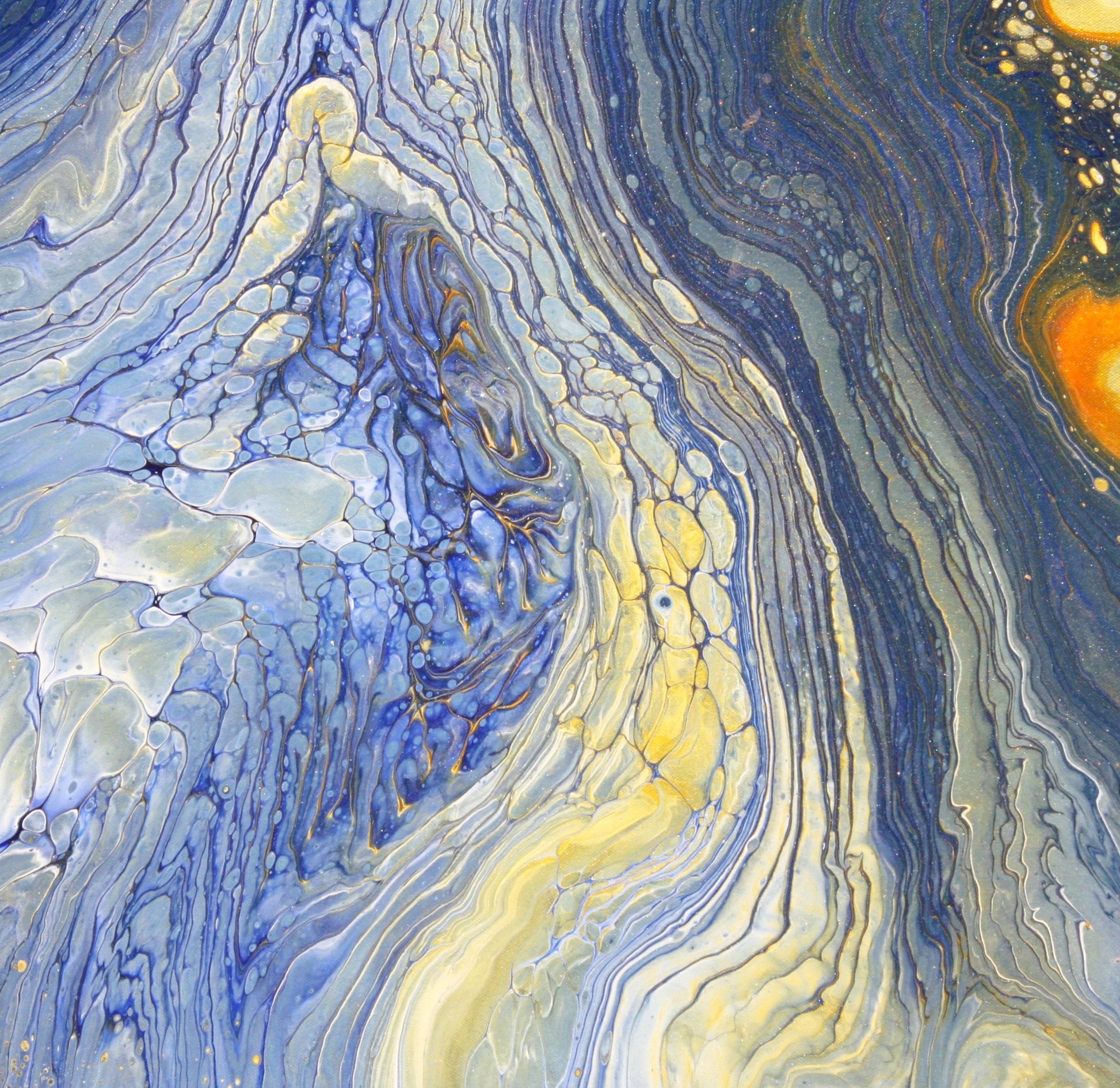Fluid art with cloud mix using an enamel medium. This technique challenges the acrylic paint and they react with each other giving the viewer a feeling there are clouds moving thru the painting.