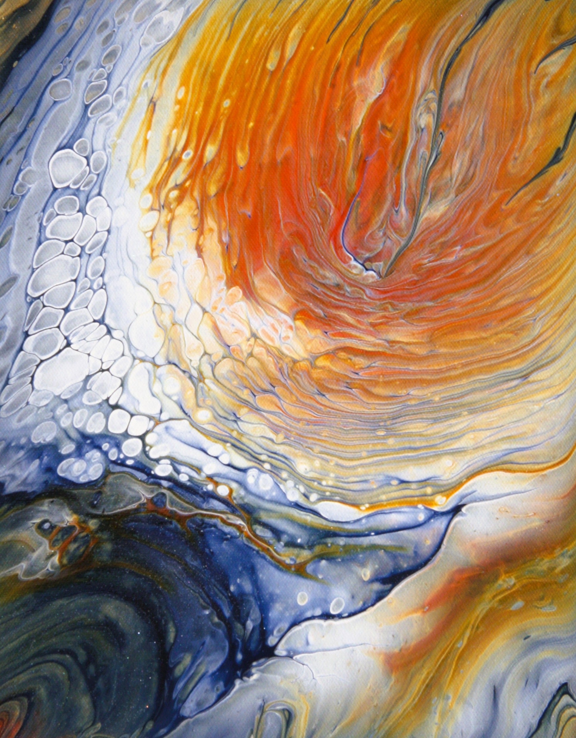 Fluid art with cloud mix using an enamel medium. This technique challenges the acrylic paint and they react with each other giving the viewer a feeling there are clouds moving thru the painting.