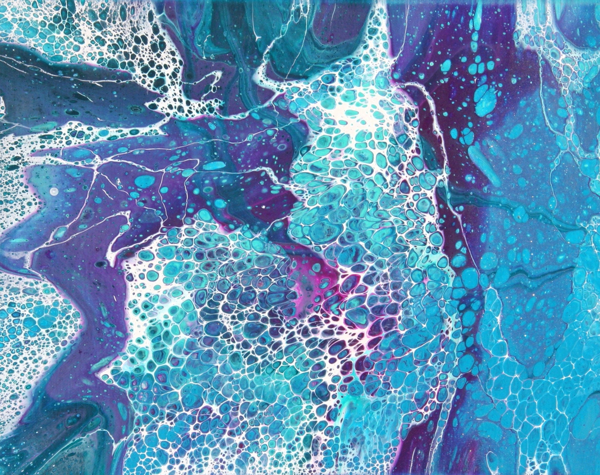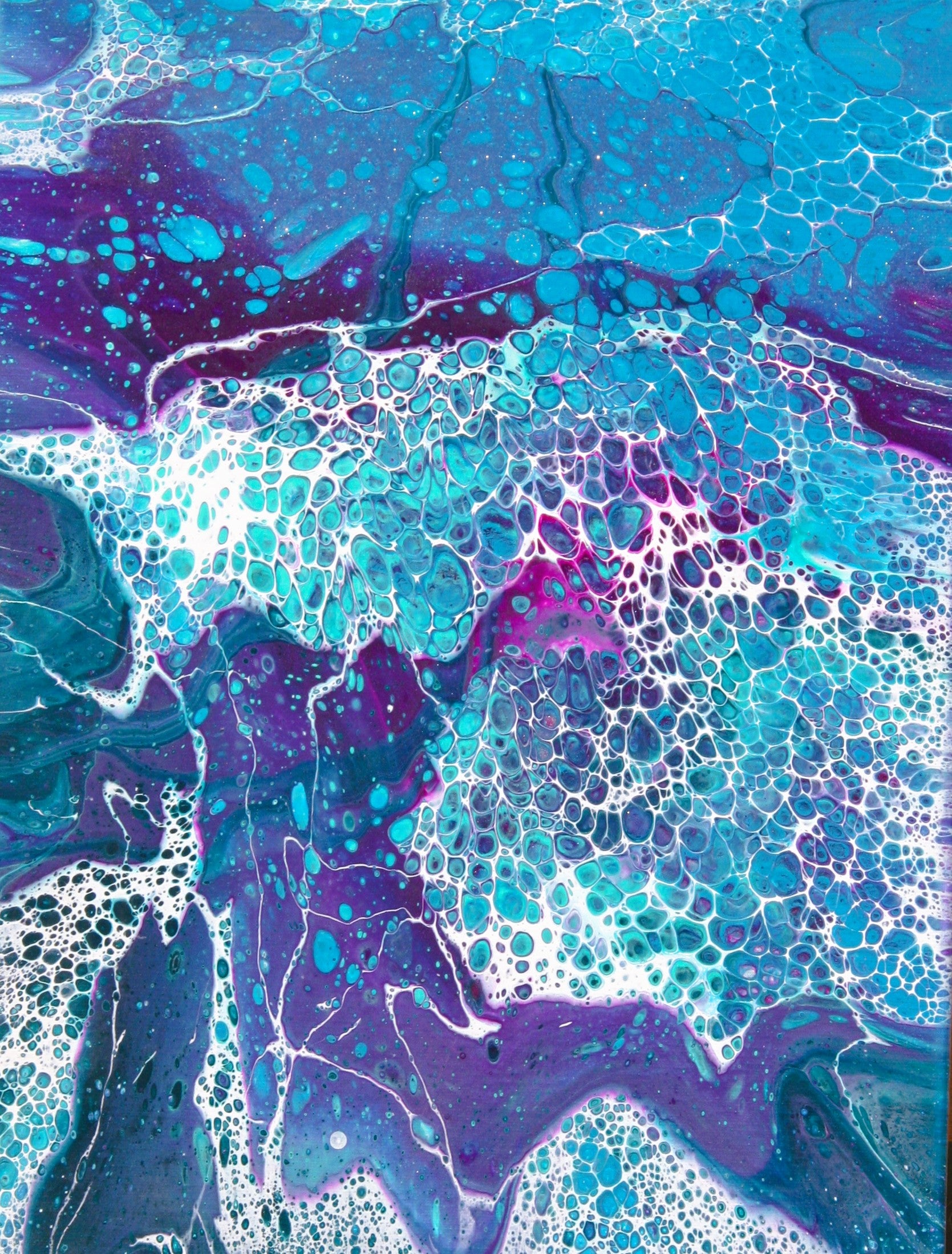 This technique starts with an initial pour, stretch it a bit then lay a white layer pouring around the edges, use a large piece of plastic to swipe initial layer paint creating a lace, then stretch off the edges to remove excess paint and pull the lacing over the surface.