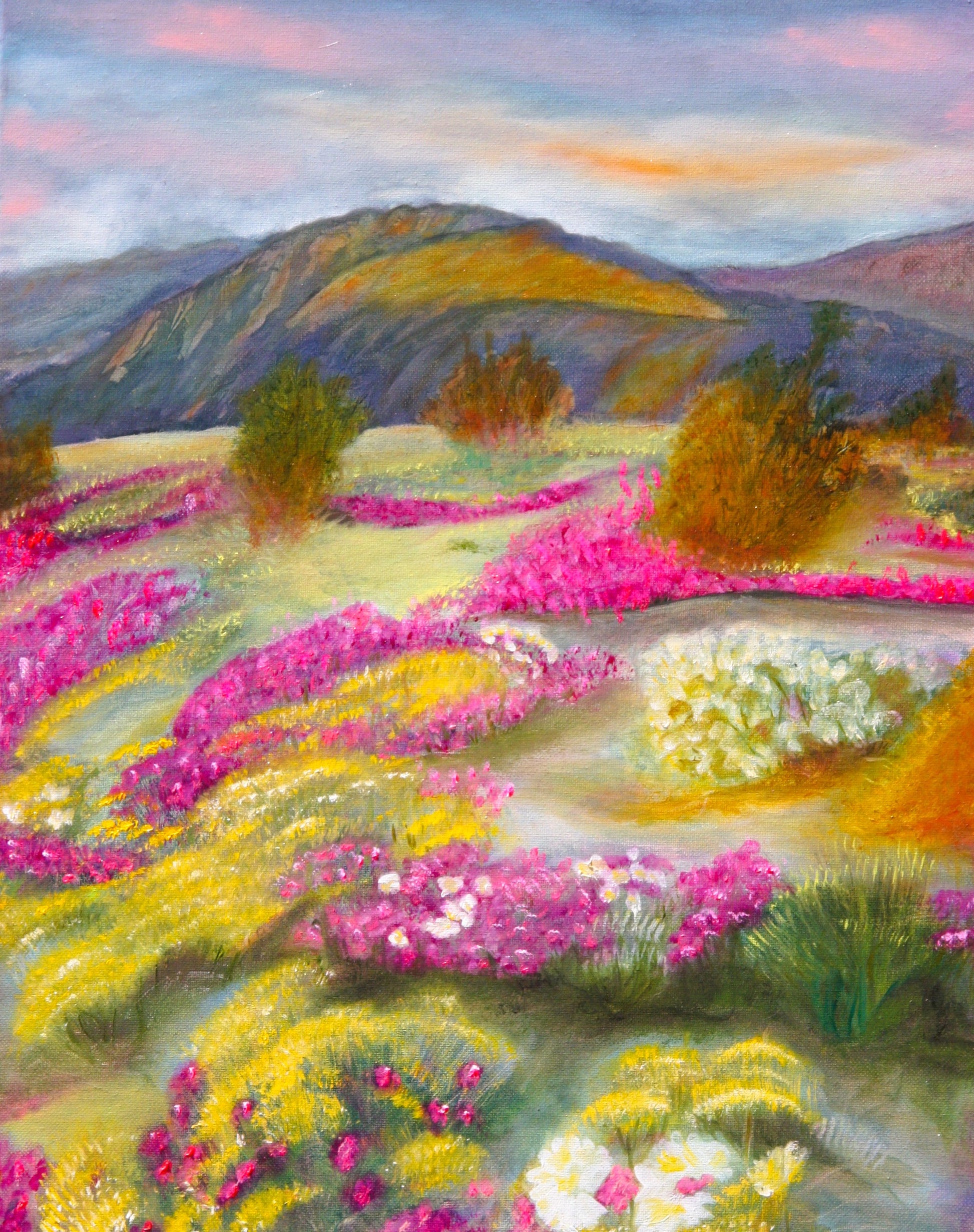 Quiet spring meadows filled with patches of pink flowers.