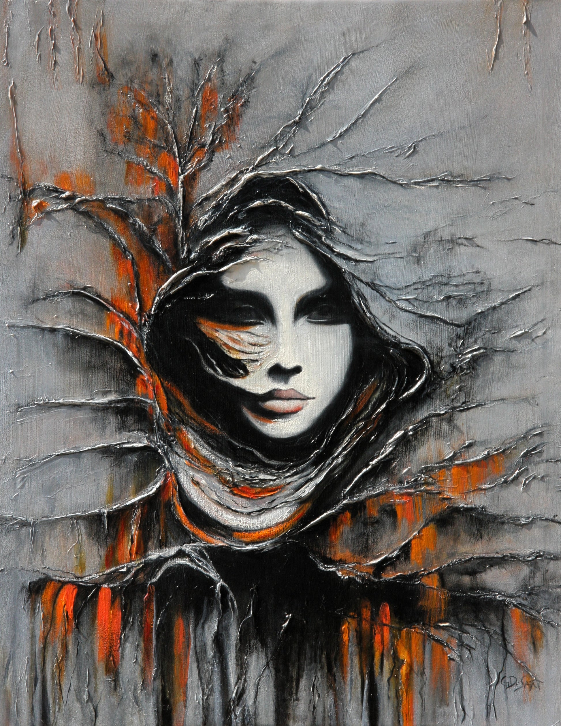 In the heart of a quiet forest where the trees hum lullabies to the wind, lives Whisperwood, a gentle spirit of change and renewal. She was born from the first breath of spring after a long harsh winter, her face, shaped from the moonlight and her cloak woven from bark, flames, and falling leaves.